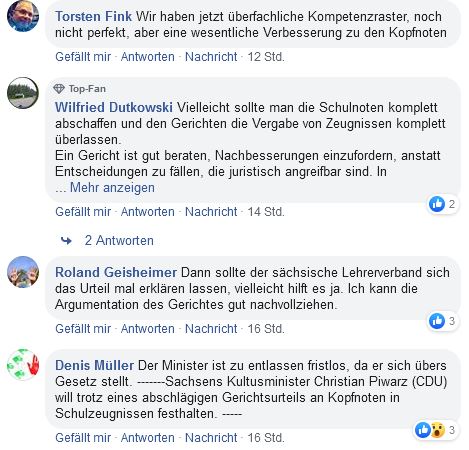 Zitat: “Aus Sicht der sächsischen Lehrerinnen und Lehrer sei dieses Urteil nicht nachvollziehbar, teilte der Sächsische Lehrerverband mit. Bei der Beurteilung sozialer Kompetenzen spielten Kopfnoten auf Zeugnissen neben den regulären Noten eine entscheidende Rolle, sagte der Landesvorsitzende des Sächsischen Lehrerverbandes, Jens Weichelt. Er forderte vom Gesetzgeber, Rechtssicherheit herzustellen.”