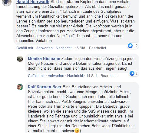 Leser diskutieren auf der Facebook-Seite von News4teachers auch den Vorschlag, statt “Kopfnoten” Bewertungen in Berichtform zu geben.