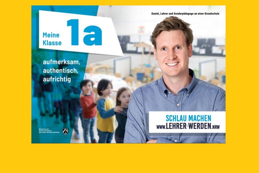 Das Schulministerium Nordrhein-Westfalen hat eine zweite Runde seiner Werbekampagne für den Lehrerberuf eingeläutet – mit neuen Motiven. Statt Plakaten mit dem in Versalien gedruckten Slogan „Job mit Pultstatus – Gönn dir“ (die Westdeutsche Allgemeine Zeitung schrieb dazu: „Peinlich-Kampagne“) werden jetzt tatsächlich Lehrer („Daniel, Lehrer und Sonderpädagoge an einer Grundschule“) in den Fokus gerückt und mit Attributen wie „aufmerksam, authentisch, aufrichtig“, „dynamisch, digital, direkt“ oder „begabt, begeistert, blitzgescheit“ versehen. In Großbuchstaben bekommen sie eine Klasse zugeteilt („1a“).
