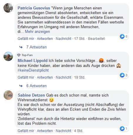 FDP-Landtagsfraktionschef Hans-Ulrich Rülke bezeichnete Eisenmanns Worte als einen unausgegorenen Schnellschuss. Eine allgemeine Dienstpflicht wäre nach Rülkes Worten verfassungswidrig. «Wir Freie Demokraten setzen beim Einsatz für die Gesellschaft auf die Freiwilligkeit mündiger junger Bürger und nicht auf Zwangsmaßnahmen von Staatsgläubigen», teilte Rülke mit.