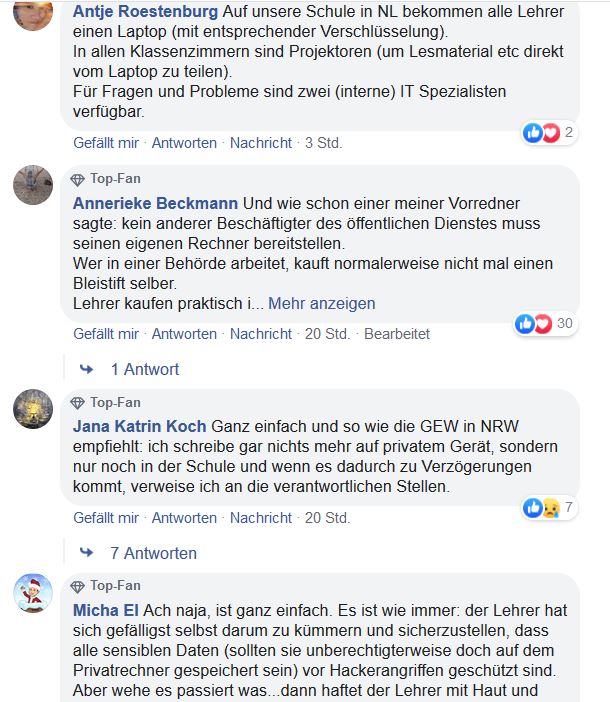 Die Schulleitungen seien letztlich dafür verantwortlich, dass sensible Informationen geschützt seien, so betonte Helga Block, Datenschutz-Beauftragte des Landes Nordrhein-Westfalen. Weil aber die Risiken von Datenlecks bei privaten Lehrer-Computern sehr groß seien, könnten die Schulleitungen gar nicht alle Sicherheitsaspekte überschauen – und dürften daher die Nutzung gar nicht genehmigen. Die GEW rät wiederum Lehrerinnen und Lehrern davon ab, die Genehmigung überhaupt zu beantragen, weil sie auch nicht sicherstellen könnten, alles richtig zu machen. Eigentlich gebe es nur einen Weg, den Datenschutz sicherzustellen: eine flächendeckende Ausstattung der Schulen mit Dienstrechnern.