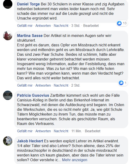 Wenn Lehrer sexualisierte Gewalt ausübten, gebe es an den Schulen «eine Rollenkonfusion», denn derjenige, der dort die Beschwerde bearbeite, sei gleichzeitig Vorgesetzter des betroffenen Lehrers, stellte Enders fest. Die Sozialpädagogin forderte eine unabhängige Beschwerdestelle gegen sexuellen Kindesmissbrauch.