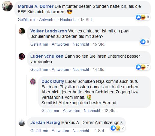 Sie unterstellen mit ihren Aussagen und Deutungen den demonstrierenden Schülern der Fridays-for-Future-Bewegung in ihrer Schule ein politisches Desinteresse und unterstellen diesen den Unterrichtsausfall als ein sie bewegendes Motiv.