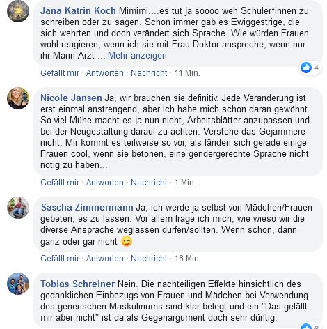 Selbst wenn, wie in Niedersachsen, den Lehrkräften ausdrücklich freigestellt ist, ob und wie sie „geschlechtergerechte“ Sprache nutzen möchten (Kultusminister Grant Hendrik Tonne, SPD: „Es ist wichtig, mitzudenken und sich immer bewusst zu machen, welche Bedeutung auch die Wortwahl, die Sprache hat.“) – es herrscht Anpassungsdruck. So berichtet der Lehrer: „Dadurch, dass die Schulleitung ihre E-Mails immer mit ‘Liebe Schülerinnen und Schüler’ beginnt, kann ich auch nicht mehr mit ‘Liebe Schüler’ kommen. Denn durch diese Norm von höchster Stelle wurde die geschlechtsübergreifende Form praktisch abgeschafft. Schreibe ich dann doch: ‘Liebe Schüler, bitte kommt morgen zur ersten Stunde, ich bin wieder gesund’, bleiben die Mädchen womöglich zu Hause. Oder ich bekomme einen Rüffel der Schulleitung oder werde zum Chauvi des Monats gewählt.“ News4teachers