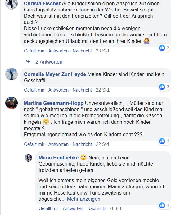 So klar wurde es schon lange nicht mehr formuliert: das Ganztagskinderaufbewahren ist erwünscht, damit möglichst alle Frauen voll arbeiten. Vermutlich wird sich zeigen, dass in der Rechnung ein Fehler ist, weil nämlich die Seelen der Kinder vergessen wurden. Ein Kind, das keine Bindungsfähigkeit entwickeln konnte, ist möglicherweise nicht so leistungsfähig wie eines mit einem stabilen Selbstwertgefühl und einer klaren Wertebasis.