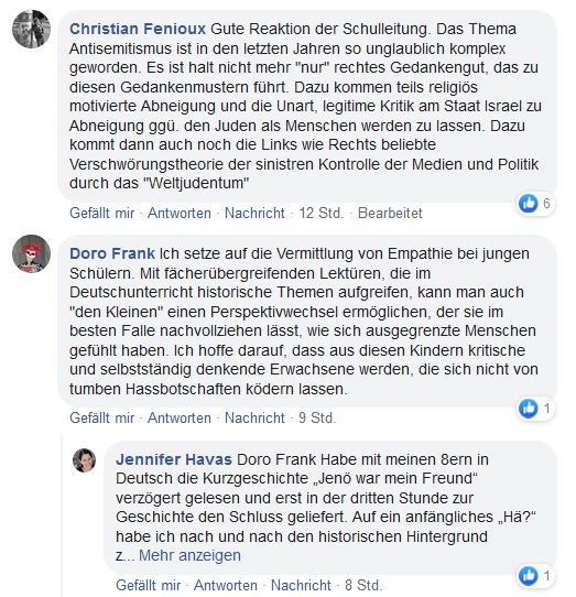Gut, wenn in solchen Fällen judenfeindlicher Texte in asozialen Medien scharf reagiert wird! Das Ganze ist nach meiner Beobachtung auch eine Ausformung der allgemeinen Tendenz, sich rücksichts- und empathielos über Andersdenkende zu äußern und gar nicht über Bedeutung und Auswirkung der eigenen Sprache nachzudenken. Das geht quer durch alle politischen oder unpolitischen Gruppen. So bezeichnete es letzte Woche ein Schüler als “asozial”, als ich einen Text über eine erteilte Hausaufgabe schrieb. Angeheizt und vorgeführt wird es auch durch die medial präsenten “Comedy”- und “Satire”-Macher.