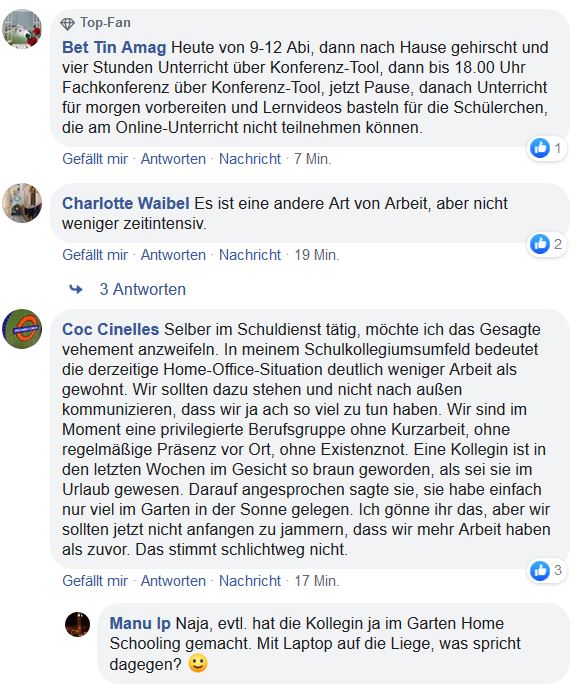 Nur kurz dazu: Samstag+ Sonntag, austragen der neuen Lernpakete. Montag: Elterngespräche am Telefon, Lösungen für die Kinder per email, Schülergespräche an der Haustür, Onlinefortbildung am Ipad, Brief von der SL zur möglichst schnellen Einarbeitung in ein Videokonferenzportal (ohne Fachwissen – bin nur verzweifelter Anwender, kein Informatiker). Versuch das ganze zu lernen und anzuwenden …kostet mich drei Tage und viele Nerven. Meinen Sohn (9), muss ich völlig missachten, um die Ansprüche von SL, Eltern und Schule zu erfüllen. Seit den Tagen vor der Schulschließung bis heute, arbeite ich (mit einem 3/4 Deputat) so viele Extrastunden (inklusive Notversorgung in den Osterferien), und habe das Gefühl nicht zu wissen wohin es geht… Ich vermisse die täglichen Routine, den Unterricht und vor allem meine Schüler. Meine Kinder leiden unter den Umständen, vor allem die fehlendem Kontakte zu Freunden machen zu schaffen.