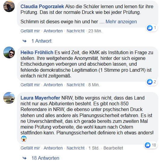 Wichtig ist in diesem Zusammenhang übrigens der Blick nach Hessen, bzw. die Frage nach dem Umgang mit den dort bereits abgelegten Prüfungen: Würden in allen anderen BL die Abiturprüfungen ausgesetzt werden und der Abschluss anhand der Durchschnittsnoten berechnet werden, bliebe die Frage wie man eine gerechte Lösung für die Hessischen Schüler hinbekäme.