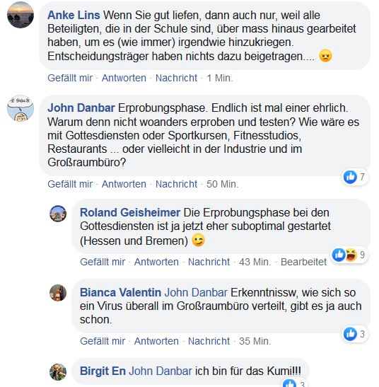 “Wenn ich dann vielleicht Corona bekomme, was solls, ich bekäme es ja sowieso irgendwann. Besser früher als später.” Nein, besser später, als früher! Je mehr Erfahrungen mit dem Virus gesammelt werden konnten, desto besser! Bitte kein Fatalismus und keine Opferbereitschaft! Das könnte von Seiten der Bildungspolitik schnell missverstanden werden.
