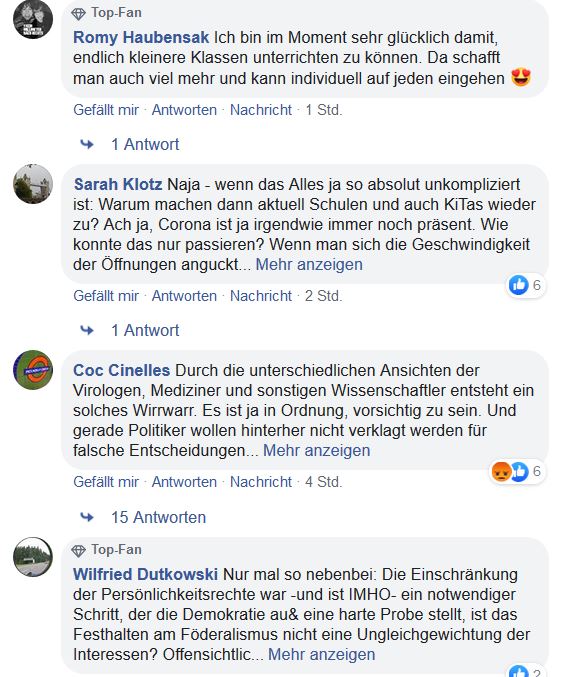 Sehr aufschlussreich ist der wissenschaftliche Kommentar von Prof. Kekulé zur Stellungnahme der medizinischen Fachverbände. Er hat die wissenschaftlichen Quellen, die darin zitiert werden, gelesen und analysiert und kommt zu dem Schluss, dass die Datenlage nicht ausreicht, um zu schlussfolgern, dass Schulen und Kitas problemlos wieder öffnen können, ohne dass Menschen dabei erkranken oder sterben können. https://www.youtube.com/watch?v=RrYjZak8XxI