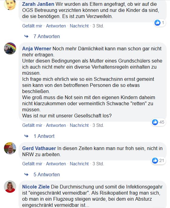Wenn es nicht sooo traurig wäre, könnte man sich über die absurden Entscheidungen des MSB in NRW schlapp lachen!! Hoffentlich merken das ganz, ganz viele Eltern wie Fr. Grubrich auch endlich und machen für das Chaos nicht die Schulleiter und Lehrer, sondern die Politiker☆innen verantwortlich !! Bitte ganz viele Emails an das MSB schreiben, nachhaken und deutlich werden!!! Ich befürchte nur, solange die Wirtschaft wieder wuppt, wird bei uns insbesondere die FDP mit ihrem Unsinn weitermachen und die Menschen für blöd verkaufen, mit Umfragen, Werbekampagnen, den überaus selbstgefälligen Statements von Fr. Gebauer und dem MSB, die z.B. jede Lehrer☆in mit dem Amtsblatt zugeschickt bekommt und auf der Webseite nachzulesen sind. Es ist leider nur die Spitze des Eisberges, die nun auch Ausstehende sehen können, von vielen schwachsinnigen Entscheidungen, die wir irgendwie in der Grundschulen in den letzten Jahre umsetzen mussten…zum Leidwesen der Schüler☆innen, denen wir in