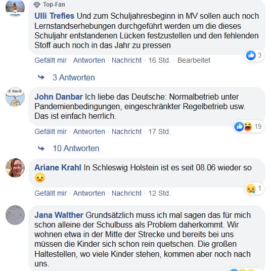 Der Nordosten sei als erstes Bundesland in die Sommerferien gestartet und nehme somit auch als erster wieder den Unterricht auf (nämlich bereits am 2. August). Deshalb müssten die kommenden Wochen intensiv genutzt werden, die Schulen auf die weiterhin besonderen Bedingungen einzustellen. «Das Coronavirus wird Anfang August nicht weg sein. Wir kehren somit nach den Ferien in den normalen Schulbetrieb zurück, aber eben unter Pandemiebedingungen», erklärte die Ministerin. Für alle Lehrer gelte dann auch wieder prinzipiell die Dienstpflicht. Freistellungen vom Präsenzunterricht seien auch bei Lehrern, die wegen Vorerkrankungen oder Alter zur Risikogruppe zählten, nur nach ärztlicher Konsultation möglich.