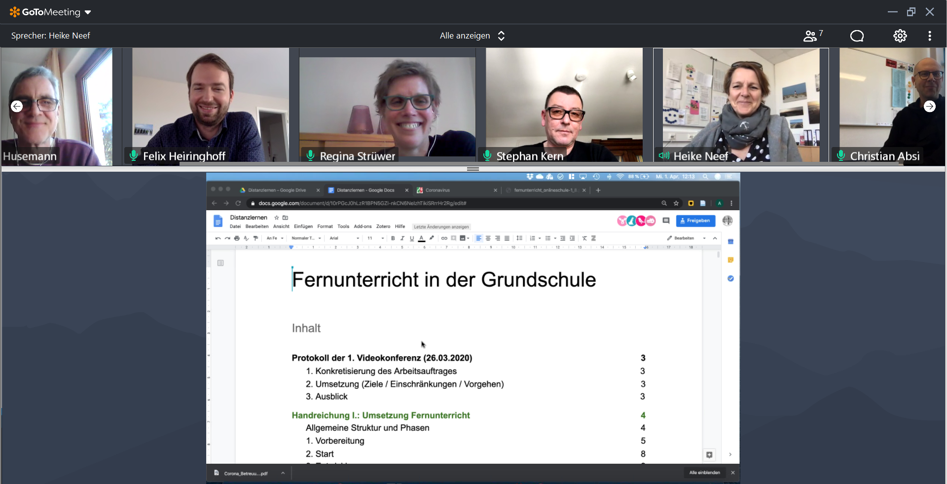 Da gemeinsame Treffen an einem Ort nicht mehr möglich waren, musste auch dieses Experten-Team von Beginn an auf virtuelle Konferenzen über das Tool „Go to Meeting“ setzen – Übertragungsverzögerung und anfängliche Verbindungsprobleme inklusive. Dennoch sagen alle Teilnehmenden, dass sie digitalen Austausch sehr effektiv empfinden. Sie können in ihren eigenen Büros sitzen und sich dennoch gegenseitig sehen und auch gleichzeitig an einem Dokument arbeiten, das dank des geteilten Bildschirms von Felix Heiringhoff während der Konferenz immer für alle sichtbar war.