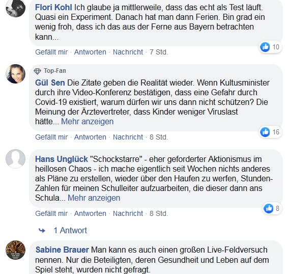„Ich bin fassungslos, erschüttert, wütend, traurig und völlig entnervt. Schulpolitik in NRW war immer schon der Versuch am lebenden Kind. Dieses Rumprobieren wird mit der Schulöffnung ohne jegliche Abstandswahrung und ohne Einhaltung der bisher erarbeiteten Hygieneregeln auf die Spitze getrieben. Die Lehrkräfte fühlen sich als Probanden einer groß angelegten Feldstudie zur Verbreitung des Coronavirus.“