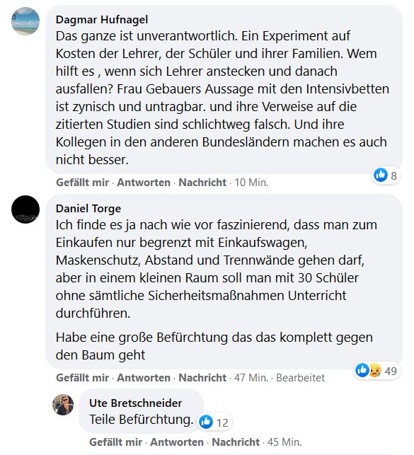 Ich arbeite in einem Berufskolleg und arbeite mit Erwachsenen. Von dieser Schulform wird von Frau Gebauer wenig geredet. Sie redet von “nicht infektiösen Kindern unter 10 Jahre ” und vergisst, dass die Mehrzahl der Schülerinnen und Schüler älter ist. Ich nenne es Scheuklappenpolitik. Zeitgleich sitzen die Politiker mit Mundschutz und abgetrennt durch Plexiglasscheiben im Bundes- oder Landtag. Da lässt sich gut entscheiden.