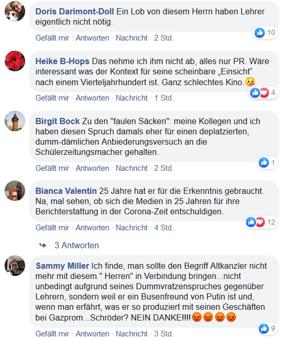 Trotzdem bekam Schröder massiven Gegenwind zu spüren. Rund 130 erboste Genossen – in der Mehrzahl eben Lehrer – gaben ihr SPD-Parteibuch zurück. Der Aufruhr war so groß, daß sich Schröder entschuldigen mußte. „Es tut mir leid, wenn Sie sich persönlich getroffen fühlen“, formulierte der spätere Kanzler zerknirscht. In einem Brief an die GEW schrieb er, dass das Interview nicht autorisiert gewesen sei. Nach Tonbandmitschnitten, die die Redakteure der Schülerzeitung und der Norddeutsche Rundfunk besaßen, waren die Zitate jedoch authentisch.