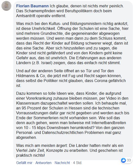 Ich stimme Ihnen zu, dass Schulöffnungen aus übertriebener Angst und Schürung von Alarmismus nicht ewig aufgeschoben werden dürfen, weil jede Übertreibung der Corona-Gefahren und Abwehrmaßnahmen durch Ignorieren der diesbezüglichen massiven Folgeschäden unverantwortlich sind.