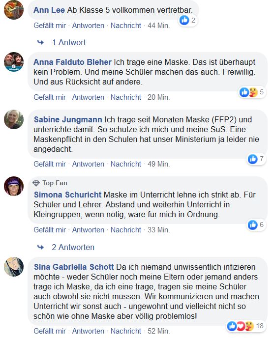 Mal ehrlich, das Leben geht weiter, auch für die Lehrer. Ich kann nicht verstehen, warum den Lehrern ständig eine Sonderstellung eingeräumt wird. Schaut mal andere Beamte an, z.B. die Polizei. Meint ihr, es interessiert da jemanden ob der Abstand gehalten werden kann? Bei jeder Kontrolle setzen sich diese Beamten erneut zahlreichen Risiken aus. Von wegen Masken und Abstand oder feste Gruppen. Da klingt es doch wie blanker Hohn wenn der Lehrer schreit, der hinter Plexiglas mit zusätzlichem Abstand und mit Maske arbeiten kann.