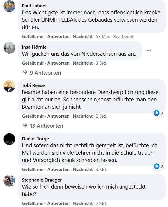 Nachvollziehbare Forderung. Im Gegenzug fordern Eltern, dass ihre Kinder am Unterricht virtuell teilnehmen können, wenn diese aus Vorsicht daheim bleiben. Das heißt zum Beispiel Übertragung des Unterrichts per Video, Einsatz funktionierender Lern- und Kommunikationslösungen (Smartboard mit digitaler Übertragung der Inhalte) und Blended Learning Konzepte. Den vorgeschoben Grund der Wahrung von Chancengleichheit, um Videounterricht mit Smartboard zu blockieren oder das Thema Datenschutz müssen beseitigt werden. Gerade an weiterführenden Schulen, insbesonders Gymnasien ist das auch ein Muss, wenn Digitalisierung des Lehrens und Lernens ernst gemeint ist. Hier sollten und können Lehrer am gleichen Strang ziehen.