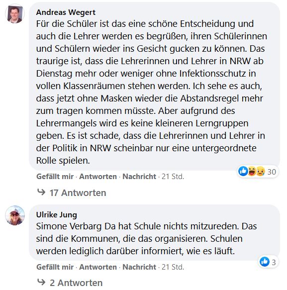 Die GEW hatte die Maskenpflicht aus pädagogischen Gründen abgelehnt. Sie hält den Schritt jetzt dennoch für leichtsinnig. Landeschefin Maike Finnern vermisst Konzepte, die eine Abnahme der Maske im Unterricht rechtfertigen. “Damit wird im Grunde der Regelbetrieb verkündet”, so schrieb sie auf Twitter. “Das kann nicht sein. Das ist Hohn für alle Schüler*innen und Lehrer*innen. Die Landesregierung hat keinen Plan B zum Infektionsschutz vorgelegt und lässt die letzte Maßnahme fallen. Nun müssen Abstand und kleinere Gruppen her.”