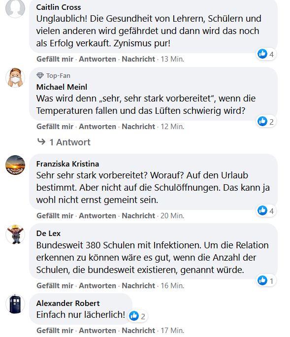 Fein, dass wenigstens die Bildungsminister ihre Arbeit so gigantisch finden. Mir erschließt sich die Logik der Maßnahmen leider immer noch nicht, bei uns fliegen die Fenster bei jedem Windstoß zu und ich freue mich auf das herbstliche Wetter mit 30 Mann in der Klasse, die keine Maske, aber jede Menge Erkältungsviren oder Schlimmeres mitbringen. Dafür hat man sich rein deskriptiv das Szenario 2 überlegt, überlässt dann aber den Schulen, wie sie den Spagat zwischen Präsenz und Homeschooling ohne die erforderliche Ausstattung hinbekommen sollen. Wenn so wenig Selbstkritik bei den Verantwortlichen inzwischen zur reflexhaften Normalität geworden ist, dürfen wir nicht mit einer ernsthaften Unterstützung rechnen.