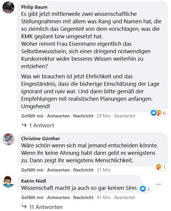 Wissenschaftler wie der Charité-Virologe Christian Drosten und der Präsident des Robert Koch-Instituts (RKI), Lothar Wieler, widersprechen der Lesart Eisenmanns und zahlreicher anderer Kultusminister. In einer Stellungnahme der Nationalen Akademie der Wissenschaften Leopoldina in Halle empfehlen sie, dass an Deutschlands Schulen von der fünften Klasse an auch im Unterricht Maske getragen werden sollte, wenn nicht ausreichend Abstand möglich ist. Sie sprechen sich zudem dafür aus, «überall, wo dies umsetzbar ist», kleine feste Kontaktgruppen einzurichten (News4teachers berichtet ausführlich über die Stellungnahme der Leopoldina – hier geht es zu dem Beitrag).