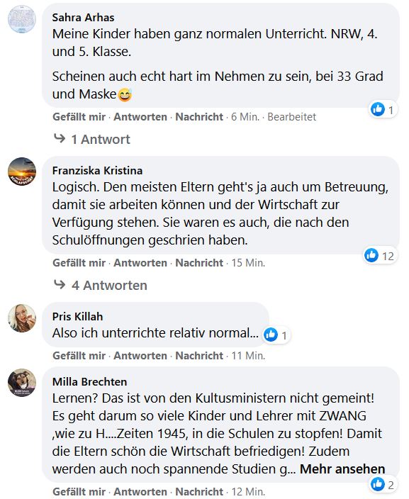 „ Infektionen würden in aller Regel von außen in die Schulen getragen.“ Was für eine unsinnige Aussage. Ja, sicher werden sie das. Genau wie überall sonst auch. Das Virus fliegt ja nicht zum Fenster rein und wartet gemütlich, bis Kinder und Lehrer da sind.