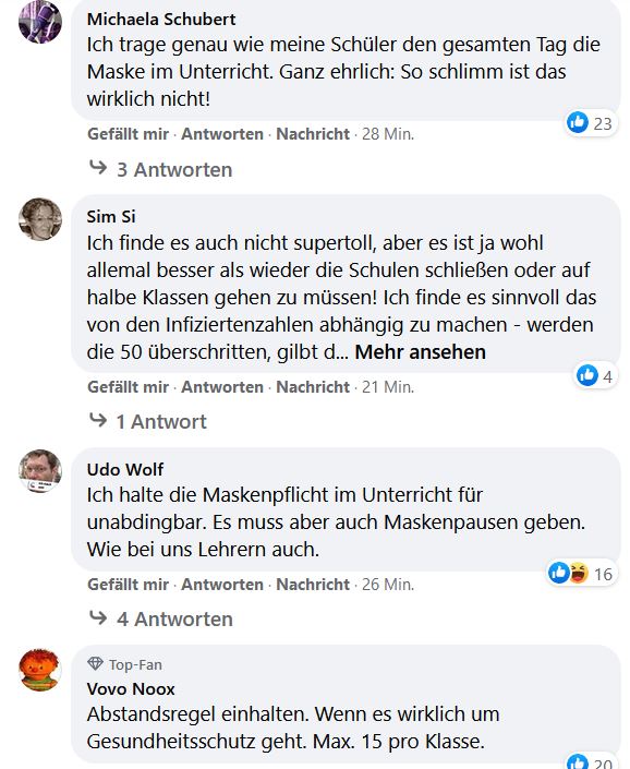 Seltsam manchmal wird den Eltern hier vorgeworfen, dass sie ihre Kinder abschieben wollen, wenn die Eltern dann ihre Fürsorgepflicht beim Thema Maskentragen wahrnehmen und der Meinung sind, dass dies nicht zu verantworten ist. Dann sind das Helikoptereltern. Schon interessant, Eltern die ihr Kind im Regelbetrieb zur Schule schicken sind unverantwortlich. Wenn die Eltern gegen die Maskenpflicht sind, dann werden sie zu Helikoptereltern. Wenn ich mir anschaue was ich mit meinem Sohn in den Zeiten der Schließung bearbeitet habe (Grundschule), dann hatte er knapp 4 Wochen Regelschule, da wurde am meisten das Fach “Stundenausfall” bearbeitet. Dann bekam er für die Sommerferien einen dicken Ordner nach Hause mit, der bearbeitet werden soll. Bildung und Schule?