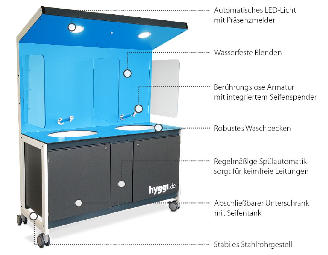 Händewaschen ist wichtiger denn je: Handhygiene und Abstandhalten sind die zwei wesentlichen Regeln zur Eindämmung des Coronavirus. An Schulen sind sie jedoch allein mit den Handwaschmöglichkeiten auf Schultoiletten kaum umzusetzen. Hier leistet Hyggi Soforthilfe: Sie kann überall aufgestellt werden, wo sie gebraucht wird – im Foyer, in Fluren, vor Mensen und Klassenräumen.