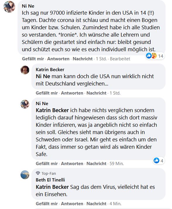 Warum die Medien auf dem Thema Schulen so herumhacken frage ich mich auch. Jeden Tag liest man den Namen der Schule, an der es Einen! Fall gegeben hat, dann wird berichtet, dass es 100 negative Tests gegeben hat. Warum kommt nicht jeden Tag gleichzeitig in den Medien, im Unternehmen xy hat es einen positiven Fall gewesen, Abteilung ab wird deshalb getestet. @ Ralf hat das mit den positiven Tests richtig dargestellt, da gibt es nichts hinzuzufügen. Und er hat Recht, die Ansteckung erfolgt außerhalb und wird dann in die Schule getragen. Sollte das mit den Aerosolen zutreffen, bringt der Abstand definitiv nichts und die Kleingruppen müssen schon sehr klein sein. Die Maskenpflicht im Unterricht finde ich unerträglich für Kinder und Jugendliche. Hier wird Politik auf dem Rücken für Kinder gemacht. Das Bildungssystem ist marode gespart, nun müssen es die Kinder ausbaden.