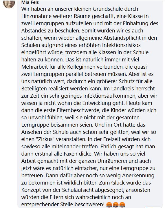 Eine Lehrerin berichtet auf der Facebook-Seite von News4teachers von ihren Erfahrungen mit kleineren Lerngruppen – und den Reaktionen darauf: