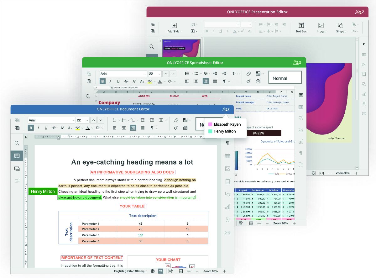 ONLYOFFICE bietet Usern darüber hinaus umfassende Online-Funktionen: Zugriff von jedem Ort und von jedem Gerät aus, schnellen Dateiaustausch und Kollaboration in Echtzeit.