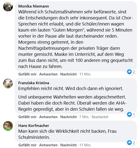 Eisenmann tobt. Die Aussagen entsprächen nicht einer vertrauenerweckenden Corona-Politik, so ließ die Ministerin mitteilen. „Dieses Vorgehen verunsichert die Eltern, Schulen und Lehrerinnen und Lehrer im Land massiv. Wir fordern das Sozialministerium auf, Stellung zu beziehen und mäßigend auf das Landesgesundheitsamt einzuwirken.“ Ein Sprecher des (vom Grünen-Politiker Manne Lucha geführten) Gesundheitsministeriums erklärte einem Bericht des „Schwäbischen Tageblatts“ zufolge, die baden-württembergischen Regeln der Corona-Verordnung blieben in Kraft. Gleichwohl dürften sich Wissenschaftler äußern.