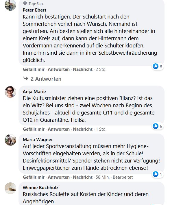«Alle geben sich wirklich Mühe, aber es läuft ein bisschen auf gut Glück», sagte Ilka Hoffmann, Vorstandsmitglied der Gewerkschaft Erziehung und Wissenschaft (GEW). Es gebe viel Verunsicherung. Schulleitungen beschwerten sich, dass vieles an ihnen hängenbleibe und der Rückhalt von der Politik fehle. «Es gibt Vorgaben, die zum Teil – etwa wegen baulicher Gegebenheiten – nicht erfüllt werden können. Und wenn dann etwas schiefgeht, heißt es da hat wohl jemand ‘ne Party gefeiert.» (So hat zum Beispiel die Berliner Bildungssenatorin Scheeres Lehrern nach einem Corona-Ausbruch an einer Schule öffentlich den Vorwurf gemacht, sich nicht an Hygieneregeln gehalten zu haben – hier geht es zum Bericht darüber auf News4teachers.)