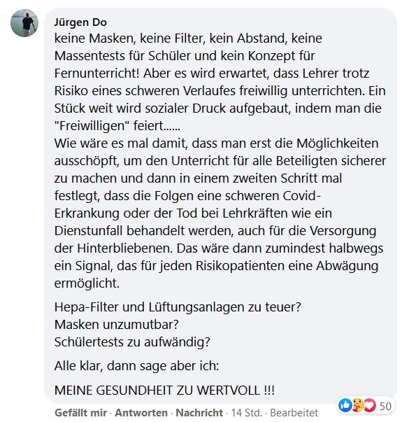 Es gibt schon jetzt Lehrermangel an vielen Schularten und gerade als Mintler würde ich mir ganz genau überlegen, ob diese Nichtwertschätzung der Gesundheit und Sicherheit, aufzuwiegen ist. Der Automotive Bereich wird weiter vom Staat gepampert, Schulen sind nicht mal Luftfilter wert.