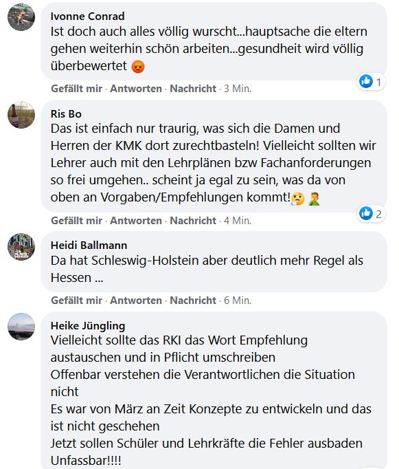 „Also Arbeitsplatz.“ Ach, und Schulen sind wohl keine Arbeitsplätze? Wenn sich zunehmend auch Lehrer infizieren, können die „wir halten auf biegen und brechen alles offen“-Befürworter meckern, wie sie wollen. Wenn es keine LK mehr gibt, werden Schulen zwangsläufig geschlossen.