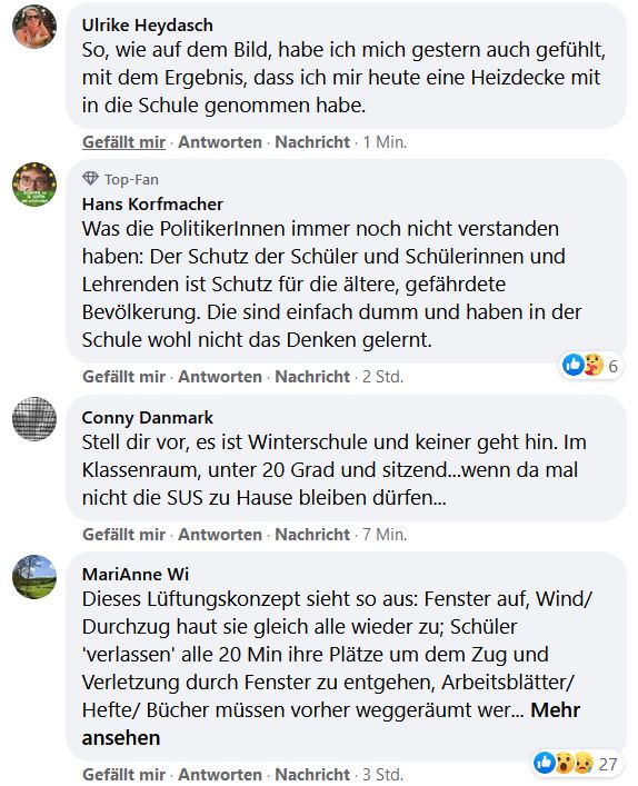 oder dass sich bisher mehr Eltern aufregen und beschweren, die GEGEN das Lüften sind, weil das eigene Kind dann im kühleren Raum sitzen muss.