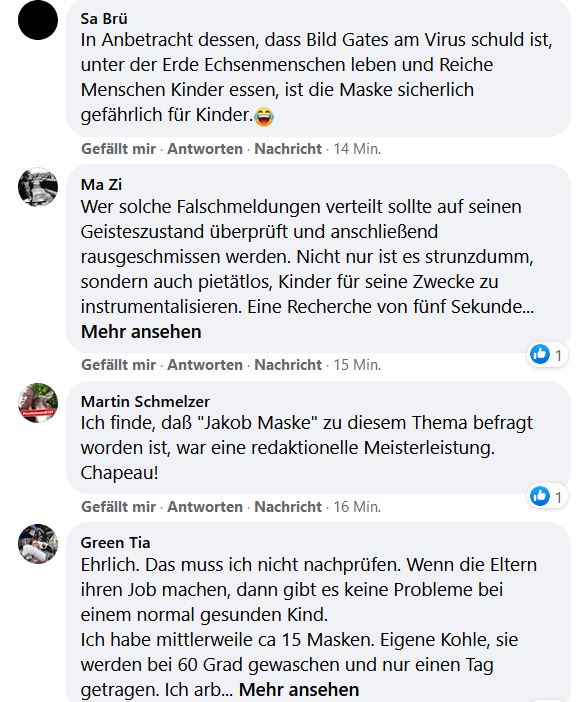 Die Diskussion um die Gefahr des Kindeswohles durch Tragen von Masken wurde durch mehrere Falschmeldungen in sozialen Netzwerken entfacht. In einem Beitrag wird etwa behauptet, dass ein sechsjähriges Mädchen bei Schweinfurt durch das Tragen einer Maske erst bewusstlos wurde und dann starb. Die Polizei in Unterfranken nahm dazu bereits Stellung: «Das sind Internetmärchen, die seit Dienstag auf verschiedenen Social-Media-Kanälen in der Region verbreitet werden», erläuterte eine Sprecherin.