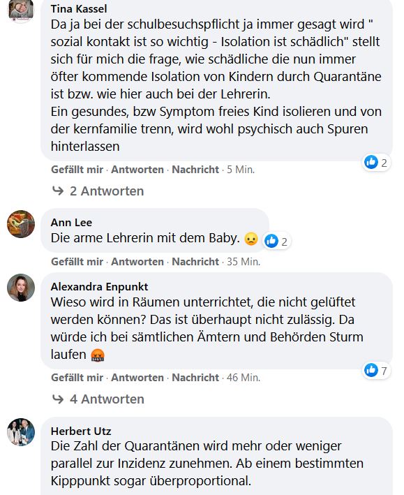Dennoch möchte ich abschließend betonen, dass in jedes Klassenzimmer unbedingt Luftfilter müssen, wenn man die Infektionsrate niedrig halten will. Außerdem sollten diejenigen, die trotz ganz klarer Richtlinien Quarantänebestimmungen nicht einhalten und in engem Körperkontakt in engen Räumen mit verbotenerweise vielen Personen feiern, entsprechend bestraft werden, weil sie damit wissentlich zur Ausbreitung beitragen.
