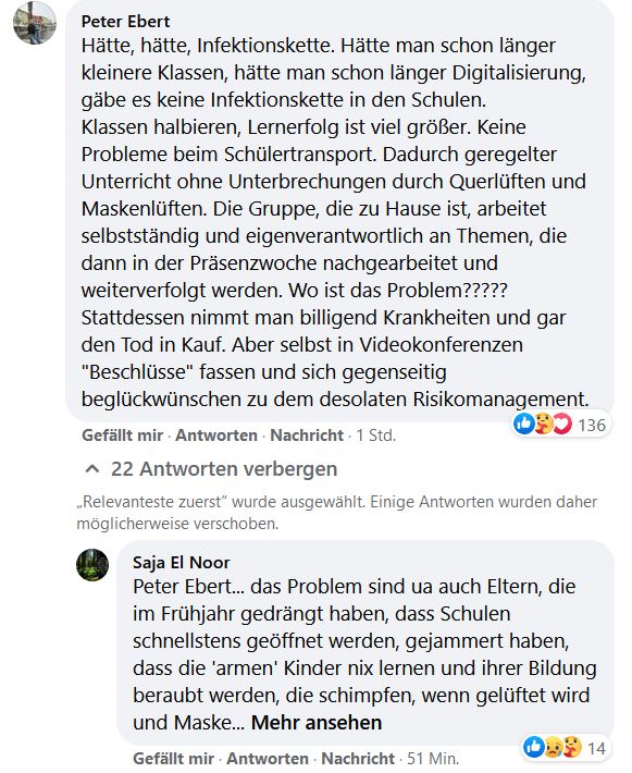 In Deutschland klappt Eigenverantwortung nicht und es ist doch niemand zu erklären, dass Kinder und Jugendliche tagsüber in der Schule unfreiwillig an einer Corona Party teilnehmen müssen, bei der das maskenlose Covidleugner Kind neben dem mit Risikoeltern sitzt, aber nachmittags nicht zu Freunden oder abends feiern sollen. Kneipen, Gaststätten sind voll, Fitnessclubs auch. Dazu die Trotteldemos der Verharmloser und Verpeilten. Und so wollen wir die Zahlen senken? Das ist doch nur noch Realsatire. Ich kann jeden Schüler verstehen, der die Hygieneregeln in der Schule nicht mehr ernst nimmt. Hier wird eine ganze Schülergeneration schutzlos einem noch relativ unbekannten Virus ausgesetzt in der Hoffnung, dass es bei toten/kranken Einzelfällen bleibt.