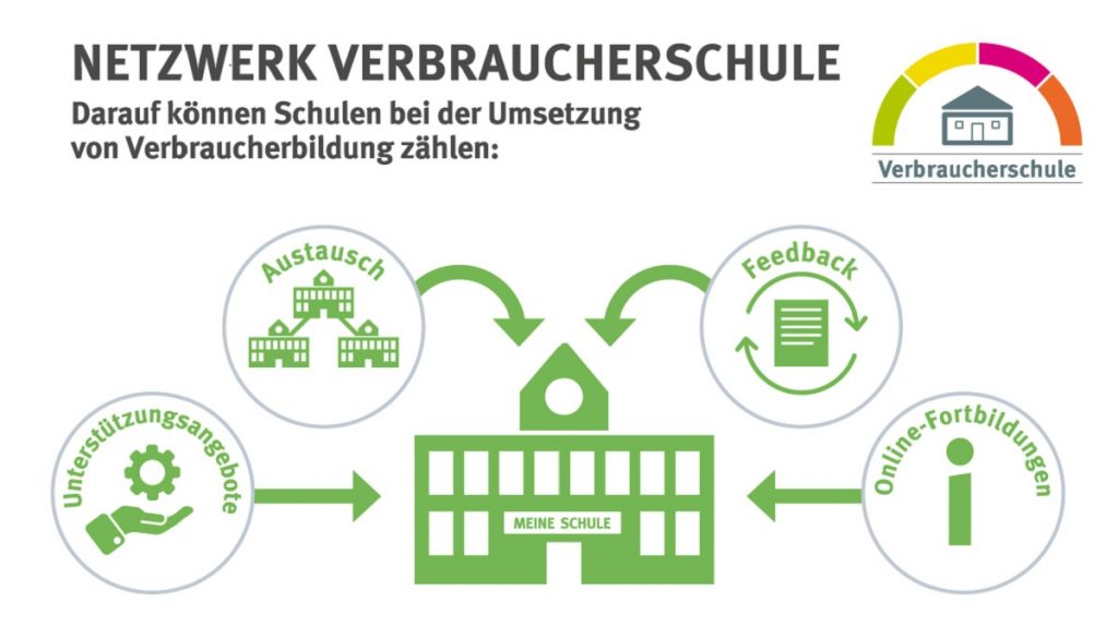 Als Mitglied im Netzwerk Verbraucherschule profitieren Schulen darüber hinaus von aktuellen Informationen zur Verbraucherbildung, kostenlosen Online-Fortbildungen und Austausch zwischen den Schulen im Netzwerk.