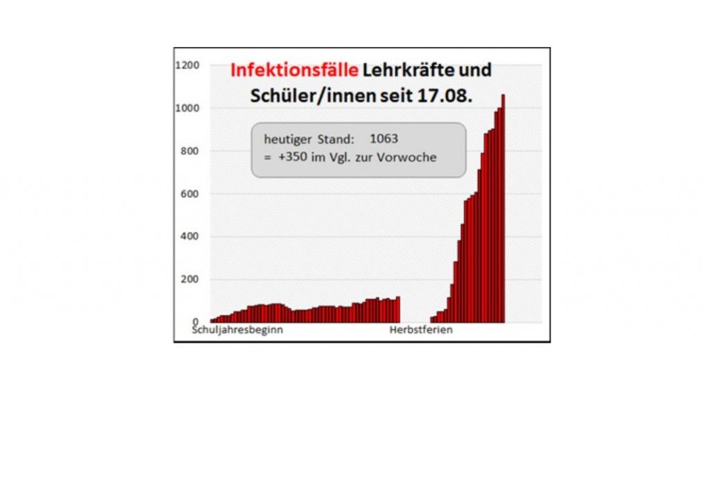 Die Aufsichts- und Dienstdirektion (ADD) Rheinland-Pfalz hat zudem Daten veröffentlicht, die auf ein exponentielles Wachstum der Infektionszahlen unter Schülern und Lehrern schließen lassen. Gab es am 20. August – also kurz nach den Sommerferien – im Land offiziell gerade mal 30 infizierte Schüler und keinen infizierten Lehrer, so stiegen die Zahlen bis zu den Herbstferien auf 99 (Schüler) und 20 (Lehrer).