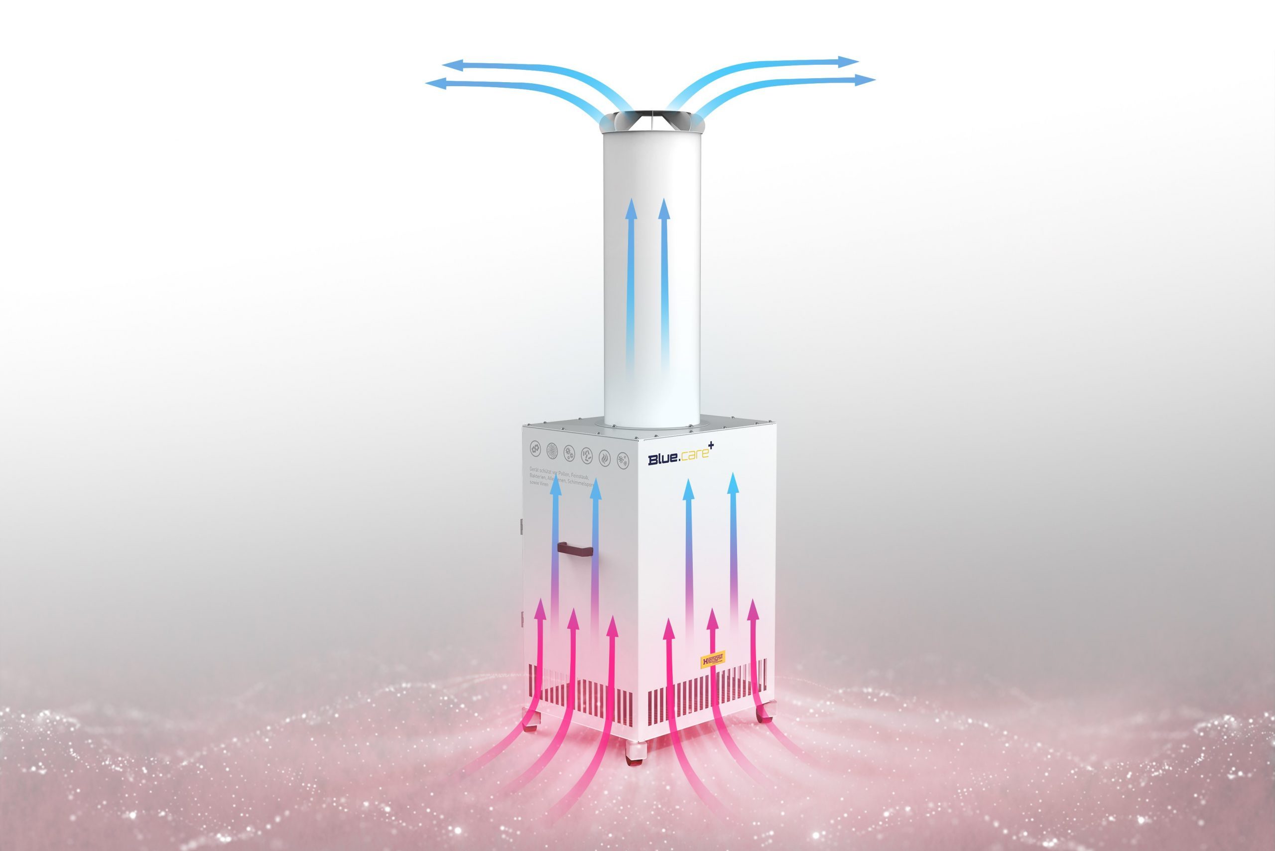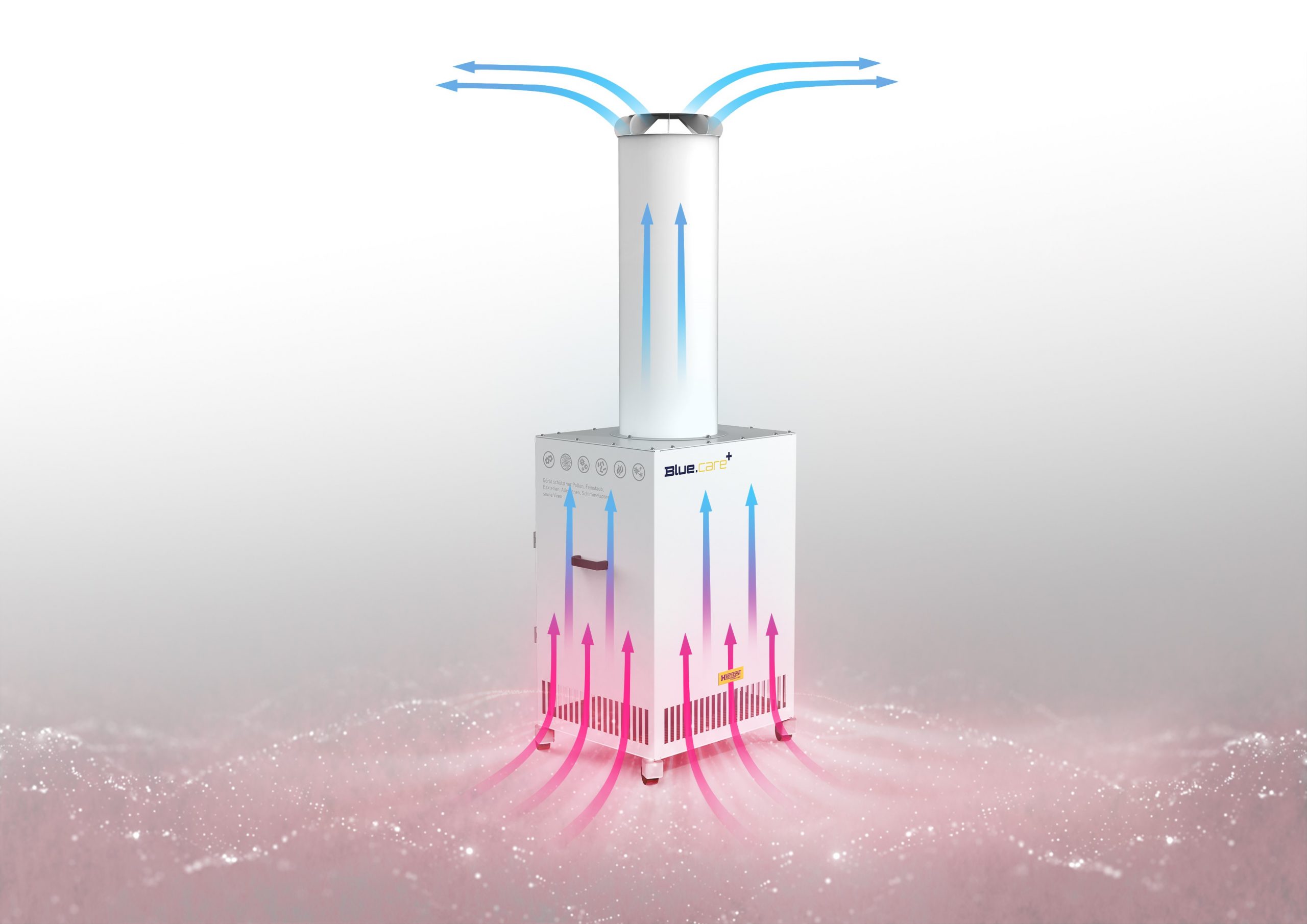 Der Blue.care+ filtert bis zu 99,995 Prozent der virenbelasteten Aerosole aus der Luft.