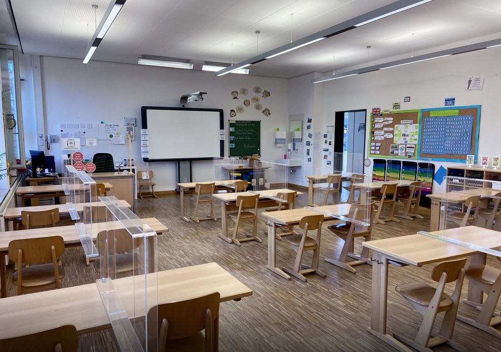Im Klassenraum sitzen zweieinhalb Dutzend Kinder mit Masken, in jeder Tischmitte trennt eine transparente Schutzwand die Sitznachbarn. Von der Wand aus brummt ein 1,30 Meter hoher, grauer Kasten – der Raumluftfilter. Die bayerische Gemeinde Neubiberg bei München, zu der Unterbiberg gehört, hat für ihre beiden Grundschulen insgesamt 40 solcher Geräte angeschafft und zusätzlich mit den neuentwickelten Acrylglas-Trennwänden ausstatten lassen. Investitionssumme: rund 150.000 Euro. Das Infektionsrisiko soll dadurch jetzt bei nahe Null liegen.