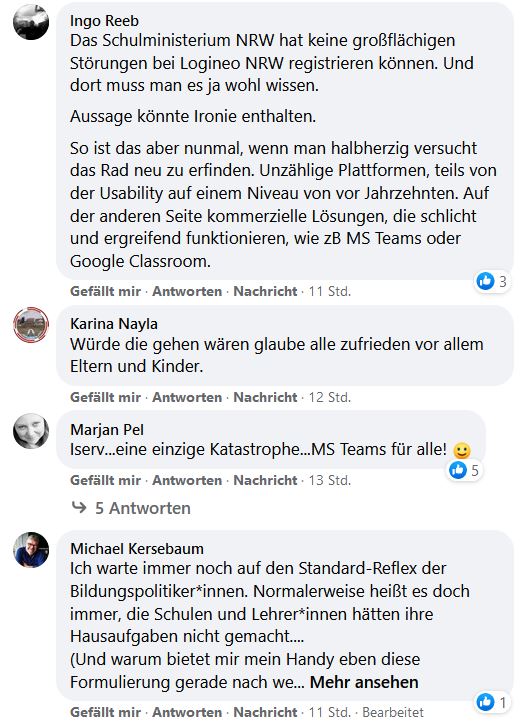 In Niedersachsen hat das Kultusministerium nicht nur Geld in der „Niedersachsen-Cloud“ sozusagen „in die Wolken geschrieben“, sondern mit dem Videokonferenztool von BigBlueButton (BBB) auf IServ auch noch die schöne Vorstellung des Ministers von byod (bring your own device / bring deine eigene Ausstattung mit) konterkariert: BBB läuft nur mit Microsoft-basierter Ausstattung einigermaßen (wenn man Echoeffekte liebt), aber mit Mac/IPad sind die wichtigen Funktionen wie Whiteboard oder Dateien hochladen etc. gar nicht möglich, ohne den Datenschutz dann doch wieder über MS Teams, Google und Co. auszutricksen. Außerdem frisst BBB über IServ offenbar Datenvolumen ohne Ende und läuft daher im ländlichen Raum nicht ordentlich (Ton ist ´ne Katastrophe, Bild wackelt, Teilnehmer fliegen ständig aus den Konferenzen usw.). Weshalb dann nicht gleich Zoom erlaubt wird, ist niemandem verständlich zu machen.
