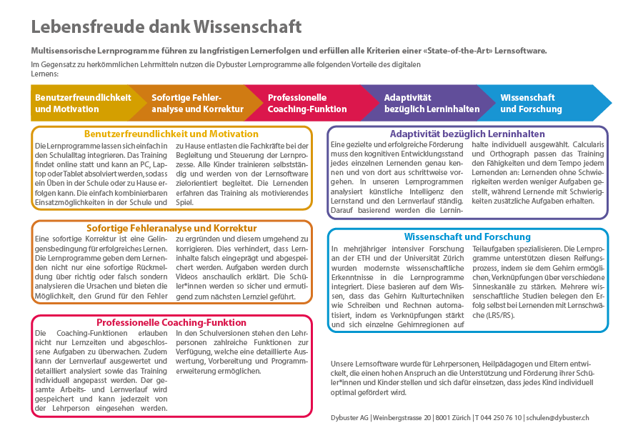 Dybuster steht für die Entwicklung eines pädagogisch wertvollen Lernsystems und bietet multisensorische Lernsysteme an, die konsequent nach dem eigens entworfenen 5-Säulen-Prinzip entwickelt wurden. Daraus eröffnen sich für die Zukunft des Lernens ganz neue Perspektiven. Im «Dybuster Future Lab» wird, in Zusammenarbeit mit anerkannten Spezialisten und Hochschulen, geforscht und getüftelt. Die Ergebnisse dieser Forschungsarbeiten fliessen in regelmässigen Updates in unsere Lernsysteme ein.