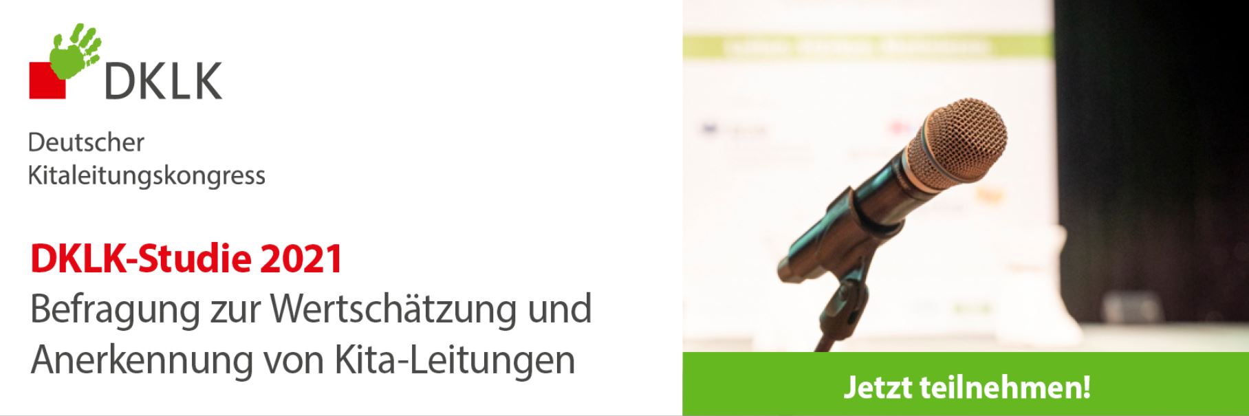 die aktuelle Pandemie bedeutet zusätzliche Herausforderungen für den Kitabetrieb – und damit ganz besonders auch für Sie als Kita-Leitung. Wir bitten Sie daher insbesondere in diesem Jahr, an der bundesweit größten und repräsentativen Umfrage unter Kita-Leitungen, der DKLK-Studie 2021, teilzunehmen (bis zum 31.03.2021). Die Teilnahme an der Umfrage ist anonym.