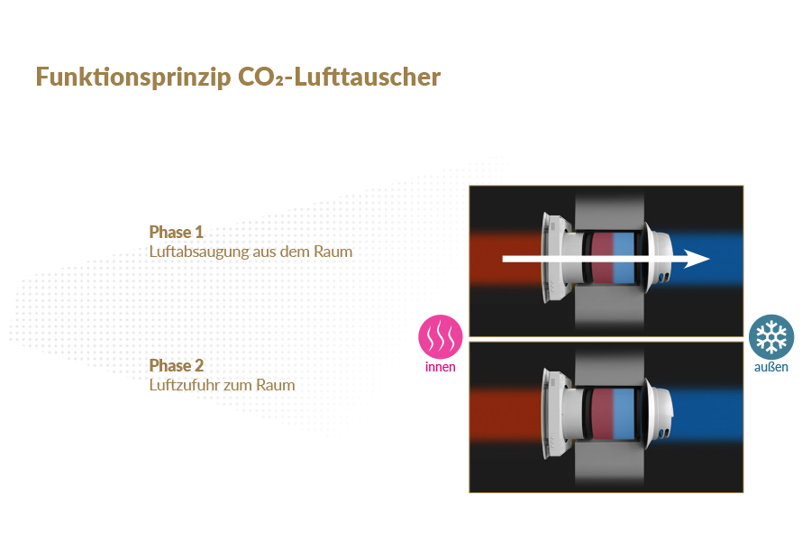 Der C02-Lufttauscher DESI® FRESH mit Wärmerückgewinnung arbeitet in zwei Phasen.