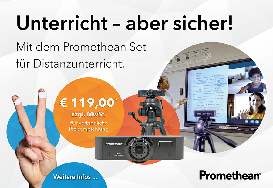 Garantiert Ihre Schulausstattung, von heute auf morgen auch außerhalb des Klassenzimmers störungsfreie und sichere Teilhabe am Unterricht sicherzustellen? Das neue Promethean Set für Distanzunterricht unterstützt Sie bei dieser Aufgabe. Einfach. Günstig. Schulgerecht!