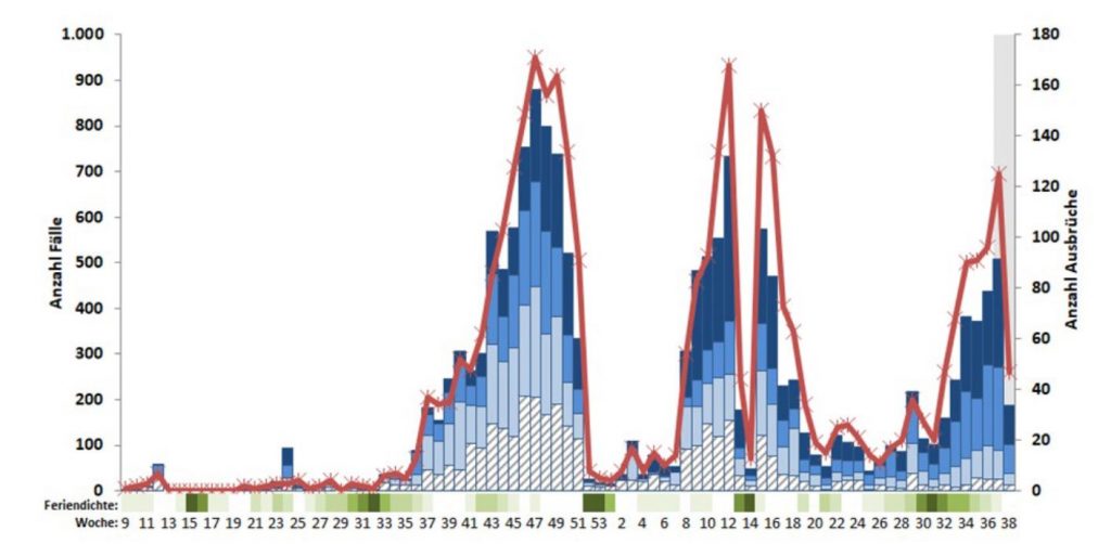 Zum ansteigenden Trend der Ausbruchshäufigkeit in Kitas und Schulen trügen vermutlich die aus den Ferien zurückkehrenden Kinder beziehungsweise das Betreuungspersonal bei, wobei (auch asymptomatische) Infektionen durch ausgeweitete Testaktivitäten frühzeitig erkannt würden. Dadurch wird ein beunruhigender Trend erkennbar: „Sowohl die übermittelte Ausbruchshäufigkeit in Kitas als auch in Schulen erreichte Anfang September 2021 ein Niveau, welches im Vorjahr erst Anfang November beobachtet werden konnte.“